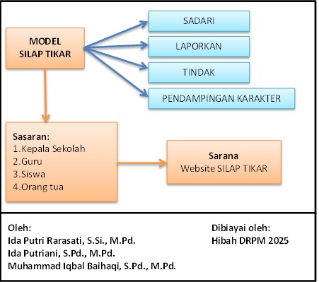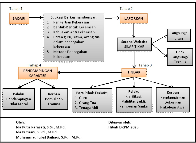 Model ini disusun secara sistematis yang terdiri dari empat langkah utama. Tahap pertama adalah sadari, seluruh warga sekolah harus menyadari kondisi diri serta lingkungan sekitar terhadap potensi segala bentuk kekerasan dengan cara memberikan edukasi berkesinambungan tentang jenis dan akibat kekerasan, kebijakan anti kekerasan di sekolah, serta peningkatan peran seluruh warga cekolah dalam mencegah kekerasan. Sosialisasi, diskusi, pelatihan dan penggunaan media digital sanagt diperlukan untuk mendukung proses edukasi anti kekerasan.   Tahap kedua adalah laporkan, seluruh warga sekolah didorong untuk berani melaporkan kejadian kekerasan yang dialamai atau yang disaksikan kepada pihak yang tepat seperti guru, kepala sekolah atau orang tua dan didukung oleh ketersediaan saluran pelaporan yang mudah diakses, aman dan rahasia. Tahap ketiga adalah tindak, setiap laporan yang yang diterima segera ditindaklajuti secara profesional yaitu memberikan kesempatan kepada pelaku dan saksi untuk memberikan klarifikasi, memvalidasi bukti-bukti, memberikan sanksi sesuai peraturan sekolah. Tahap keempat adalah pendampingan karakter, dilakukan dengan memberikan pendampingan psikologis berkelanjutan kepada korban untuk mengatasi trauma, pembinan karakter dan pendidikan moral kepada pelaku untuk mengembangkan empati dan tanggung jawab sosial. Model ini diimplementasikan dengan bantuan sarana website Silap Tikar untuk memudahkan sistematika pelayanan kepada seluruh warga sekolah. Website tersebut berisi tentang materi-materi anti kekerasan, peraturan sekolah, formulir pelaporan kasus kekerasan, formulir berita acara penanganan kasus, formulir kesimpulan kasus, dan formulir kegiatan pendampingan karakter. Selain itu juga terdapat menu publikasi untuk mendokumentasikan kegiatan anti kekerasan yang telah dilakukan oleh sekolah.